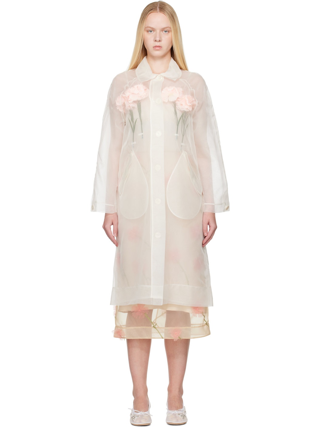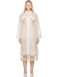 Sheer silk organza coat. · Spread collar · Button closure · Integrated artificial flowers at front interior · Flap pockets · Raglan sleeves · Button fastening at cuffs · Storm flap · Central vent at back hem · Fully lined Supplier color: Ivory Body: 100% silk. Trim: 100% polyester. Made in Portugal 251405F059002