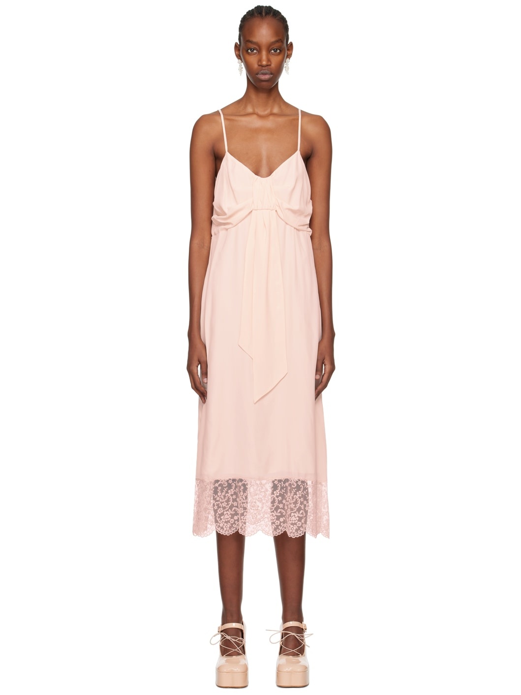 Acetate- and silk-blend crepe de chine dress. · V-neck · Gathering and bow accent at front · Lace trim and scalloped edges at hem · Adjustable spaghetti straps · Full viscose satin lining Supplier color: Pale rose