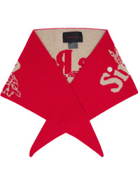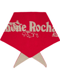 Triangular knit merino wool- and cashmere-blend scarf. · Jacquard logo graphic throughout · Faux-pearls at face · L15" x W23" Featuring artwork by Oscar Torrans. Supplier color: Red/Oat 90% merino wool, 10% cashmere. Made in Portugal 252405M150006