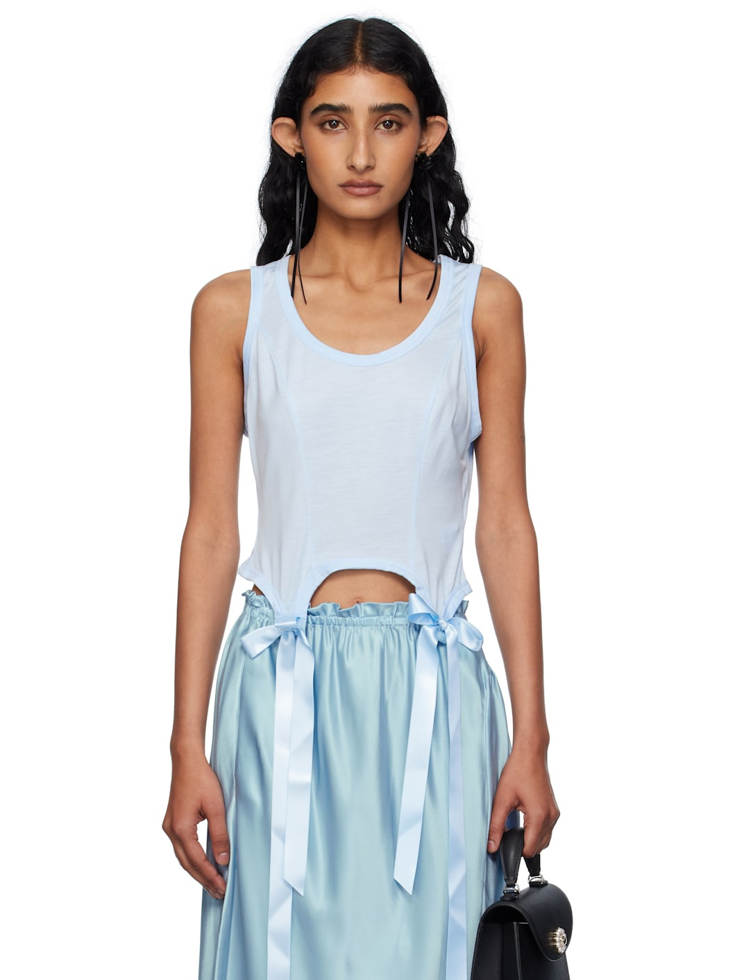 Semi-sheer lyocell jersey tank top. · Scoop neck · Princess seams at bodice · Bow accents at front hem · Cropped curved hem Available exclusively at SSENSE. Supplier color: Baby Blue Body: 100% lyocell. Trim: 100% polyester. Made in Portugal 252405F111011