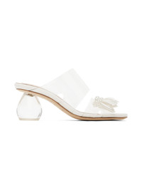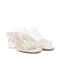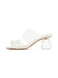 Transparent vinyl slip-on heeled sandals. · Cutouts throughout · Open square toe · Faux-pearl accents at vamp · Logo embossed at padded leather footbed · Perspex® sculptural block heel with rubber injection · Nubuck sole · Heel: H2.5" Supplier color: Clear/Ivory/Pearl Upper: synthetic. Sole: leather, synthetic. Made in Portugal 241405F125000