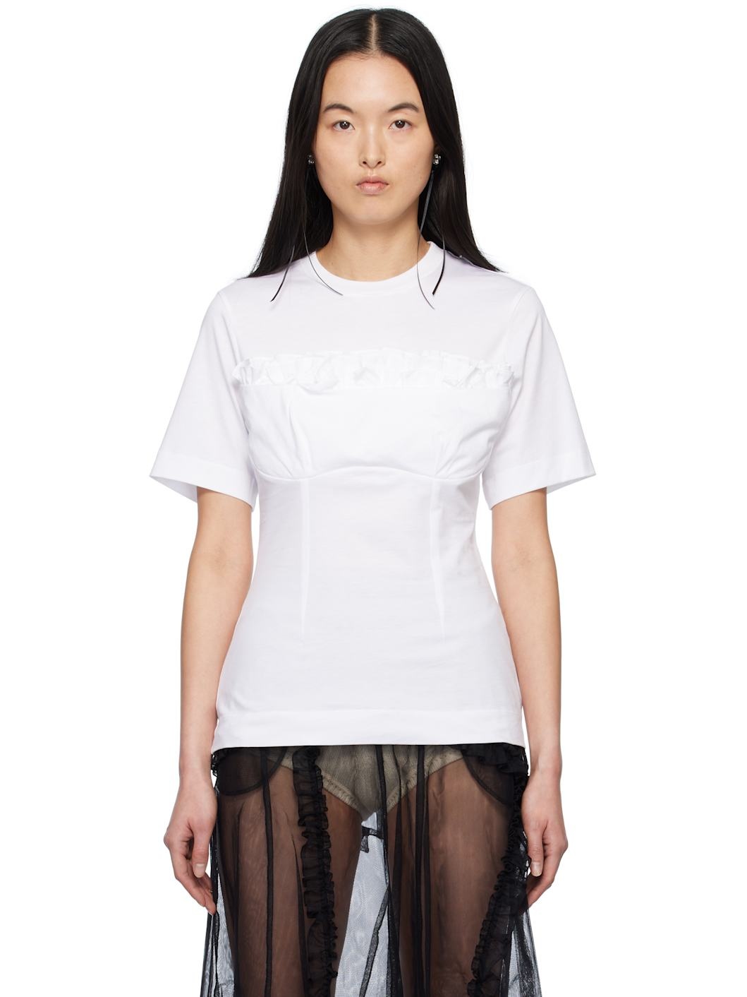 Cotton jersey T-shirt. · Rib-knit crewneck · Ruffled trim at chest · Darts at chest and bodice Supplier color: White Body: 100% cotton. Trim: 100% cotton. Made in Portugal 251405F110023