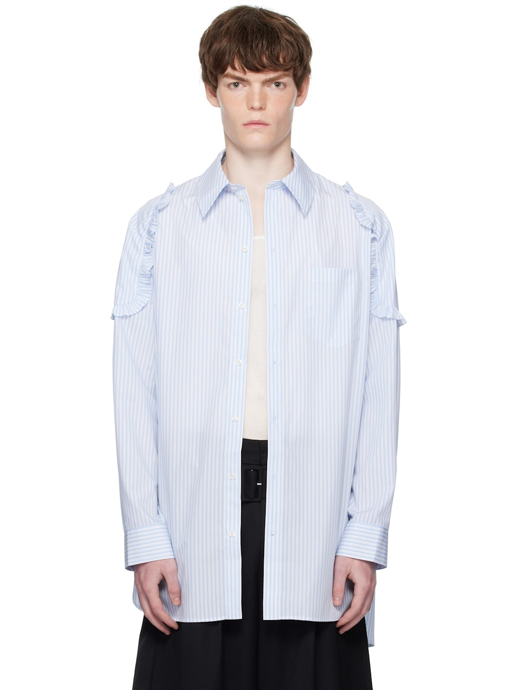 Cotton poplin shirt. · Stripes throughout · Spread collar · Button closure · Patch pocket at chest · Shirttail hem · Ruffled trim at shoulders · Buttoned barrel cuffs · Box pleat at back yoke Supplier color: White/Blue 100% cotton. Made in Portugal 252405M192020