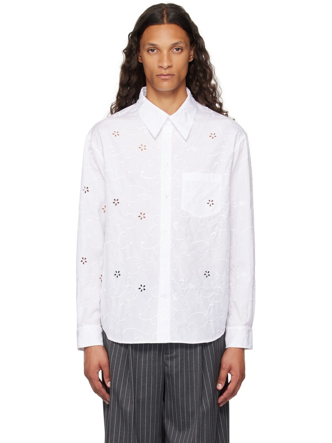 Cotton broderie anglaise shirt. · Spread collar · Button closure · Patch pocket · Shirttail hem · Single-button barrel cuffs · Box pleat at back yoke Supplier color: White 100% cotton. Made in Portugal 242405M192022
