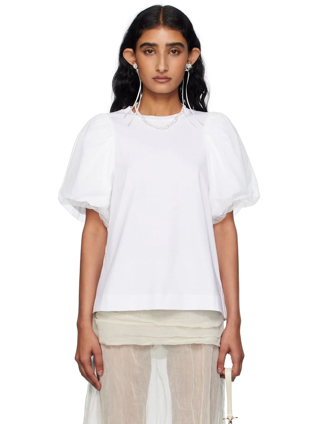 Cotton jersey T-shirt. · Rib-knit crewneck · Tulle overlay at puff sleeves Supplier color: White Body: 100% cotton. Trim: 100% polyamide. Made in Portugal 252405F110005