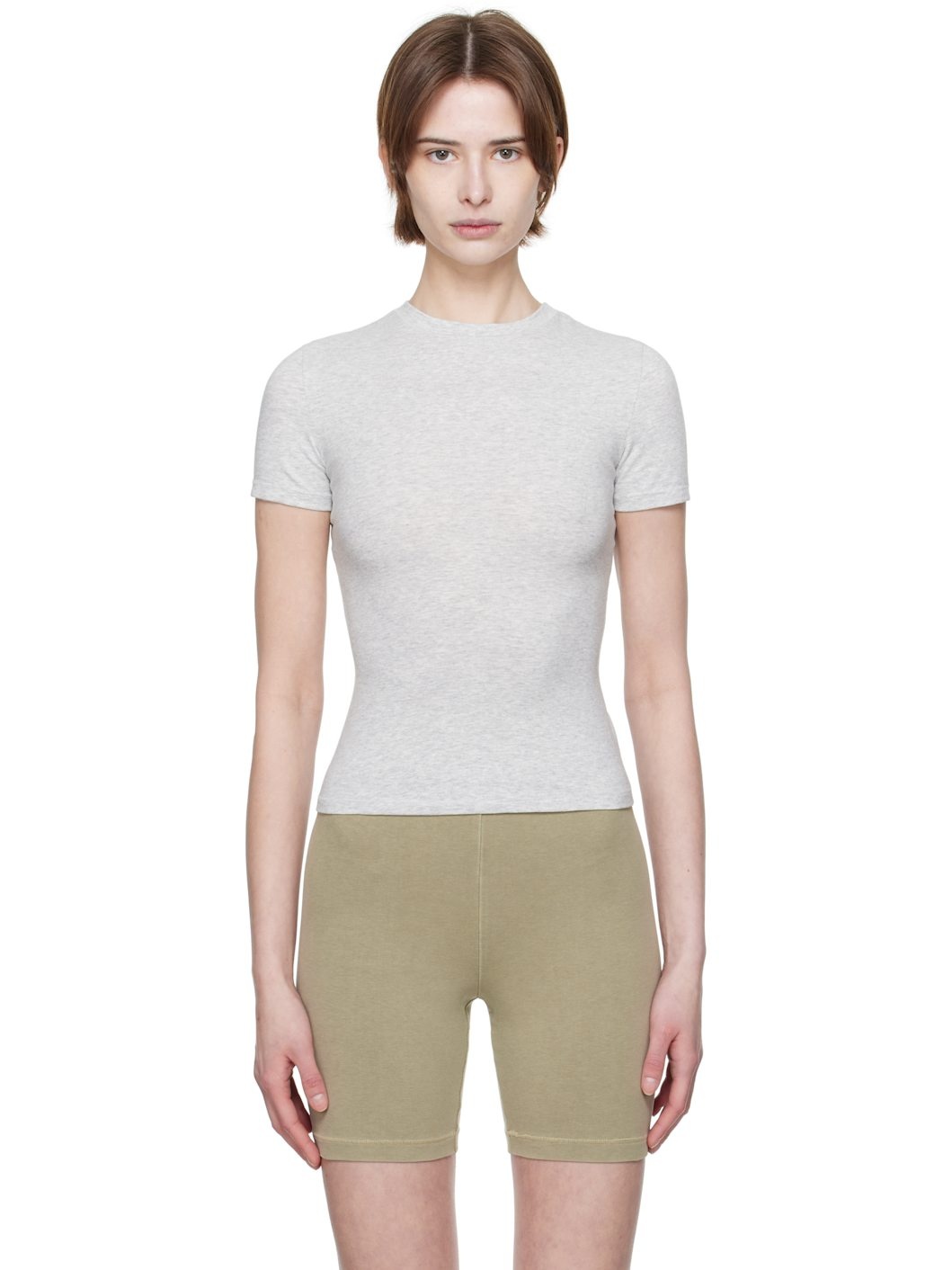Slim-fit stretch cotton jersey T-shirt. · Lightweight · Rib-knit crewneck · Cropped hem · Pick stitching at hem and cuffs Supplier color: Light heather grey 90% cotton, 10% elastane. Made in Thailand 251545F110012