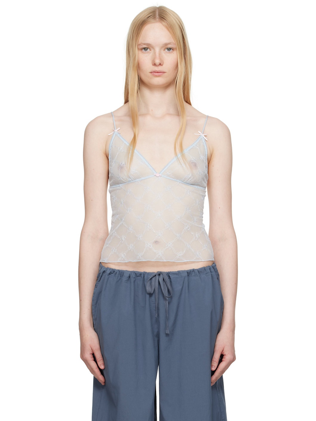 Sheer nylon tulle camisole. Embroidered graphic pattern throughout. · Picot trim at plunging V-neck · Floral applique at chest · Bow applique at adjustable spaghetti straps Wholesale exclusivity at SSENSE. Supplier color: Powder blue bow tulle 100% polyamide. Made in Indonesia 252545F079012