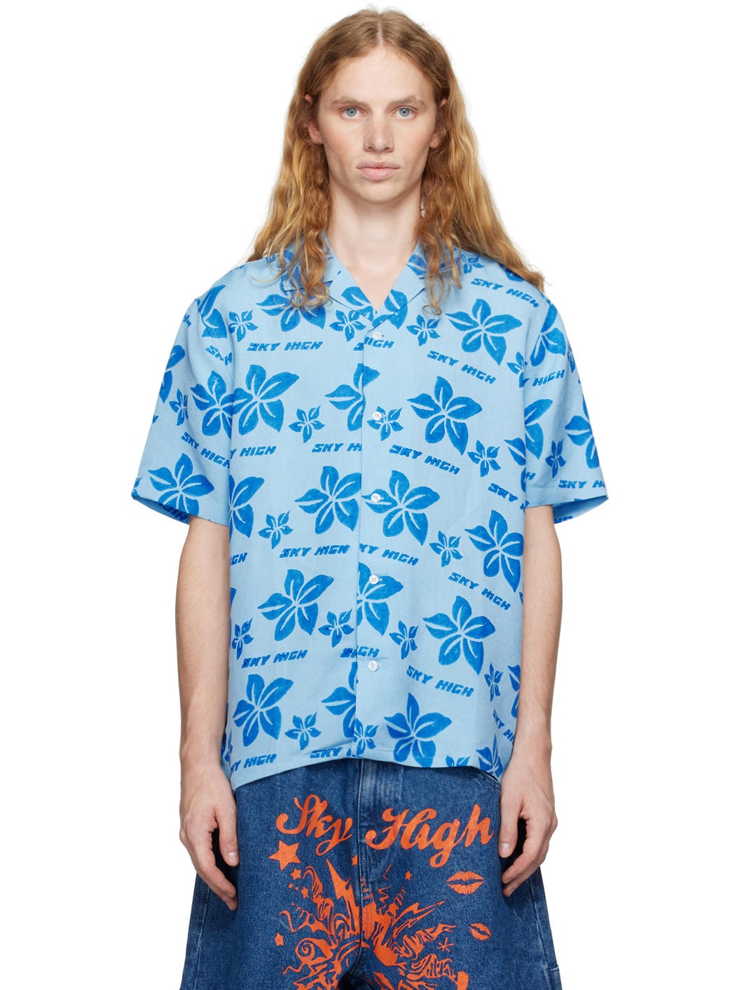 Lightweight linen- and viscose-blend duck canvas shirt. Floral logo pattern hand-block-printed throughout. · Boxy-fit · Open spread collar · Button closure · Cropped hem Featuring artwork by Vanna Youngstein. Supplier color: Blue 55% linen, 45% viscose. Made in India 242219M192002