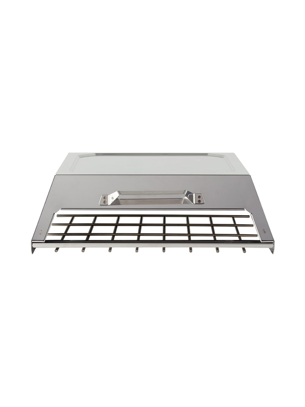 Packable and portable modular stainless steel oven in silver-tone. Logo embossed throughout. Includes carry bag and webbing oven straps with press-release fastening. - Heat-resistant porcelain plate in black - Grill net - Field Oven for baking - Detachable logo-engraved plate - Compatible with the Takibi Fire & Grill and Pack & Carry Fireplace handle - H18 x W18.5 x H 6 in / 14.5 lbs ( 6.6 kg)
