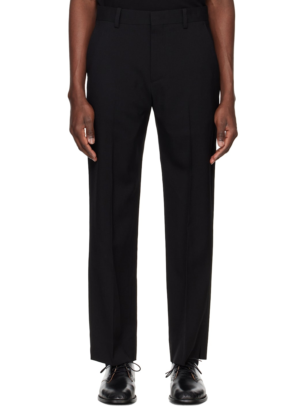 Plain-woven wool trousers. · Belt-loops · Four-pocket styling · Zip fly · Creased legs · Vent at outseams · Darts at back Supplier color: Black 100% wool. Made in South Korea 251221M191012
