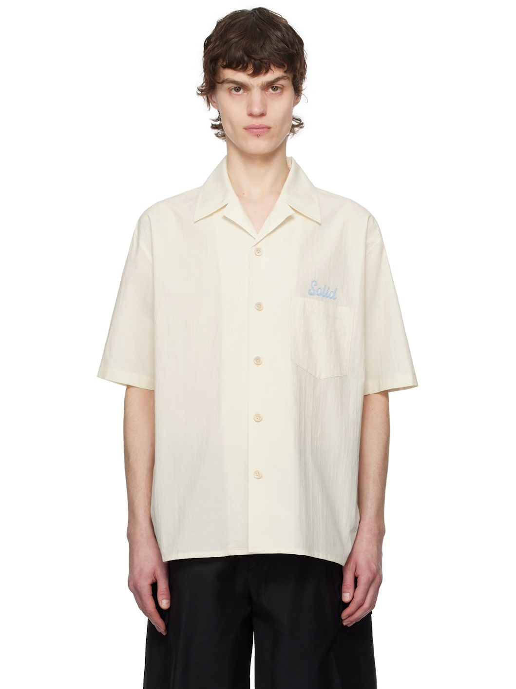 Semi-sheer crinkled cotton poplin shirt. · Open spread collar · Logo embroidered at chest · Patch pocket · Vented side seams · Pleats at back yoke Supplier color: Off-white 100% cotton. Made in South Korea 251221M192007