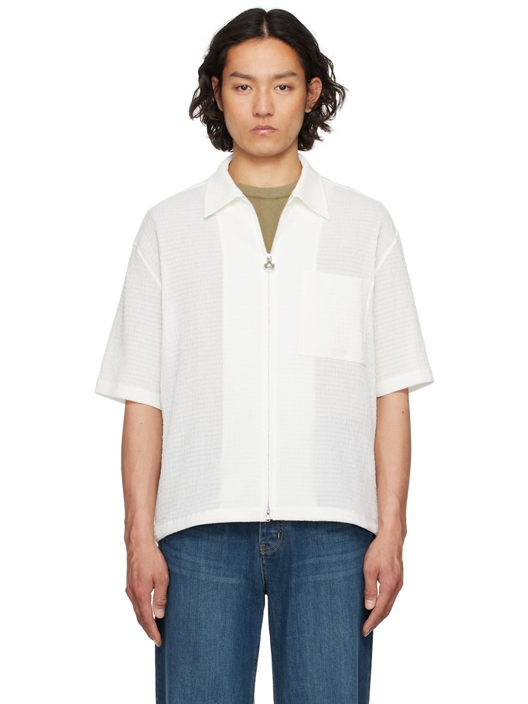 Stretch polyester- and cotton-blend gauze shirt. · Spread collar · Two-way zip closure · Patch pocket · Bungee-style drawstring at hem · Locker loop at yoke Supplier color: White 69% polyester, 30% cotton, 1% polyurethane. Made in South Korea 251221M192010