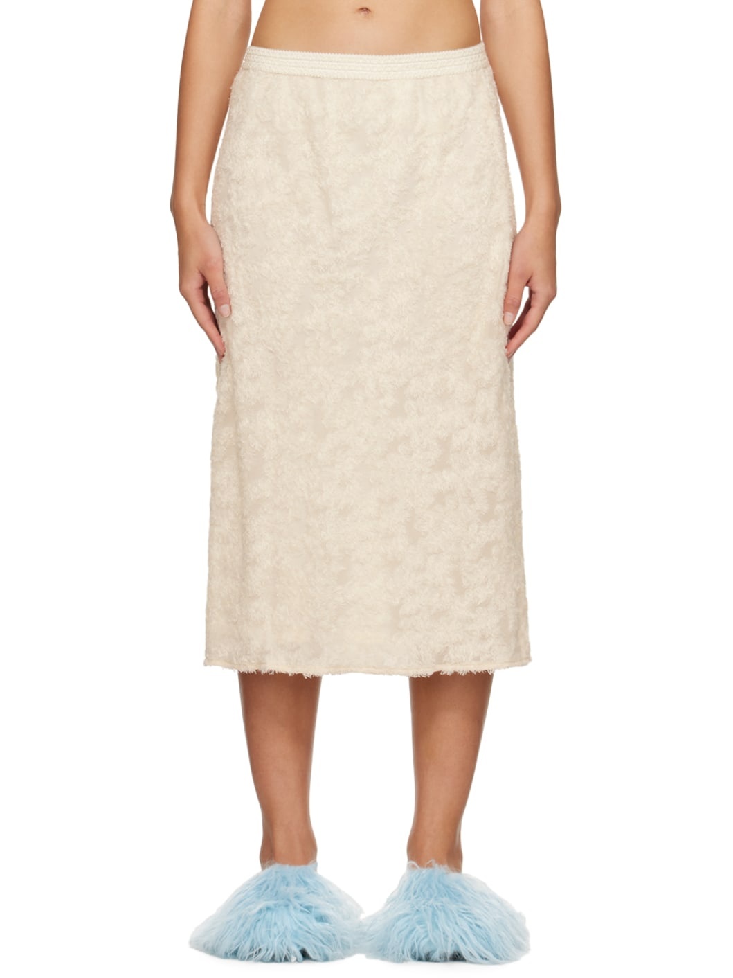 Plain-woven polyester- and cupro-blend skirt. Graphic pattern flocked throughout. · Elasticized waistband · Full cupro satin lining Supplier color: White Body: 75% polyester, 25% cupro. Lining: 100% cupro. Made in Australia 241699F092000