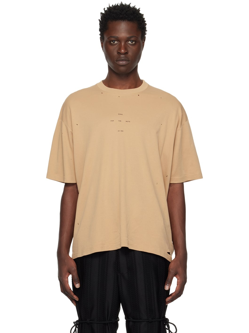 Cotton jersey T-shirt. Distressing throughout. · Rib knit crewneck · Logo printed at front · Dropped shoulders · Graphics printed at back Supplier color: Tan 100% cotton. Made in Australia 231699M213002