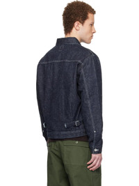 Non-stretch 13 oz denim jacket. · Speckled pattern throughout · Spread collar · Button closure · Pleats and embroidered detailing at front · Flap pockets at chest · Dropped shoulders · Stud at barrel cuffs · Darts and cinch straps at back · Antiqued silver-tone hardware · Contrast stitching in white Supplier color: Indigo 100% cotton. Made in Japan 252294M177000