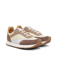 Low-top paneled suede, nubuck, and canvas sneakers in brown and beige. · Lace-up closure · Logo patch at padded tongue · Padded collar · Buffed leather and mesh lining · Foam rubber midsole · Treaded rubber outsole Supplier color: Nougat Upper: leather, textile. Sole: rubber. Made in Slovakia (Slovak Republic) 231818F128027