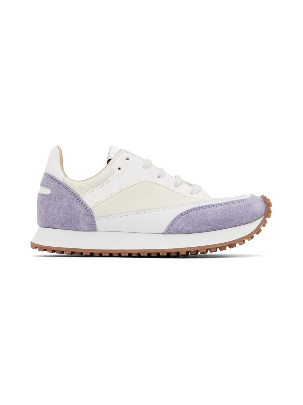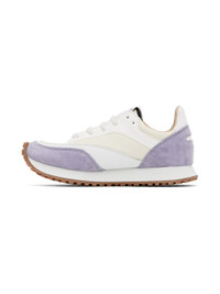 Low-top paneled suede, nubuck, and nylon twill sneakers in white and purple. · Lace-up closure · Padded tongue and collar · Buffed leather and mesh lining · Foam rubber midsole · Treaded rubber outsole Supplier color: Lavender Upper: leather, textile. Sole: rubber. Made in Slovakia (Slovak Republic) 231818F128028