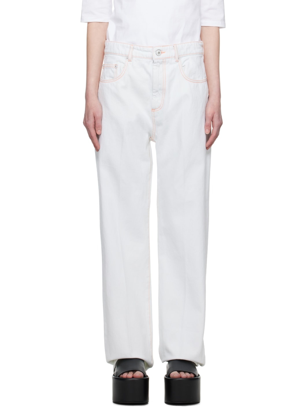 Straight-leg non-stretch denim jeans. · Low-rise · Belt loops · Five-pocket styling · Zip-fly · Creased legs · Leather logo patch at back waistband · Logo-engraved silver-tone hardware · Contrast stitching in orange Supplier color: White 100% cotton. Made in Tunisia 231301F069005