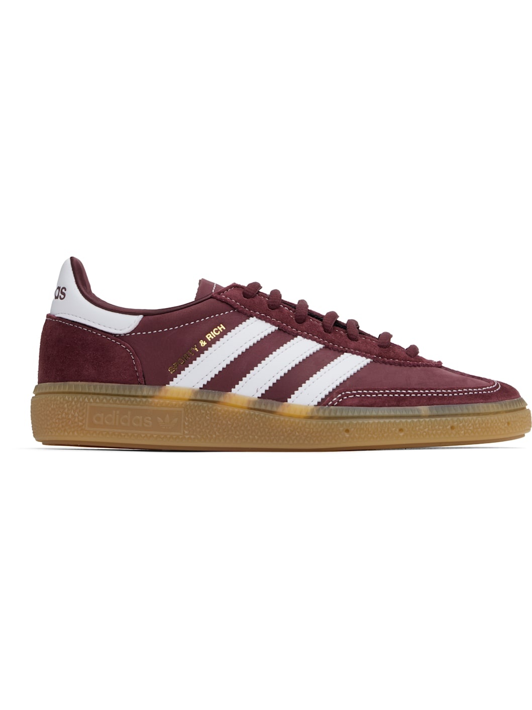 Low-top nubuck and suede sneakers in burgundy. · Lace-up closure · Logo patch at tongue · Padded collar · Signature serrated stripes at sides · Logo stamp at outer side · Logo embossed at heel tab · Quilted satin and canvas lining · Logo embossed at crepe-rubber midsole · Treaded rubber sole · Contrast stitching in white · Includes additional laces in white Part of the Sporty & Rich x adidas Originals collaboration. Supplier color: Merlot Upper: leather. Sole: rubber. Made in Viet Nam 251446F128003