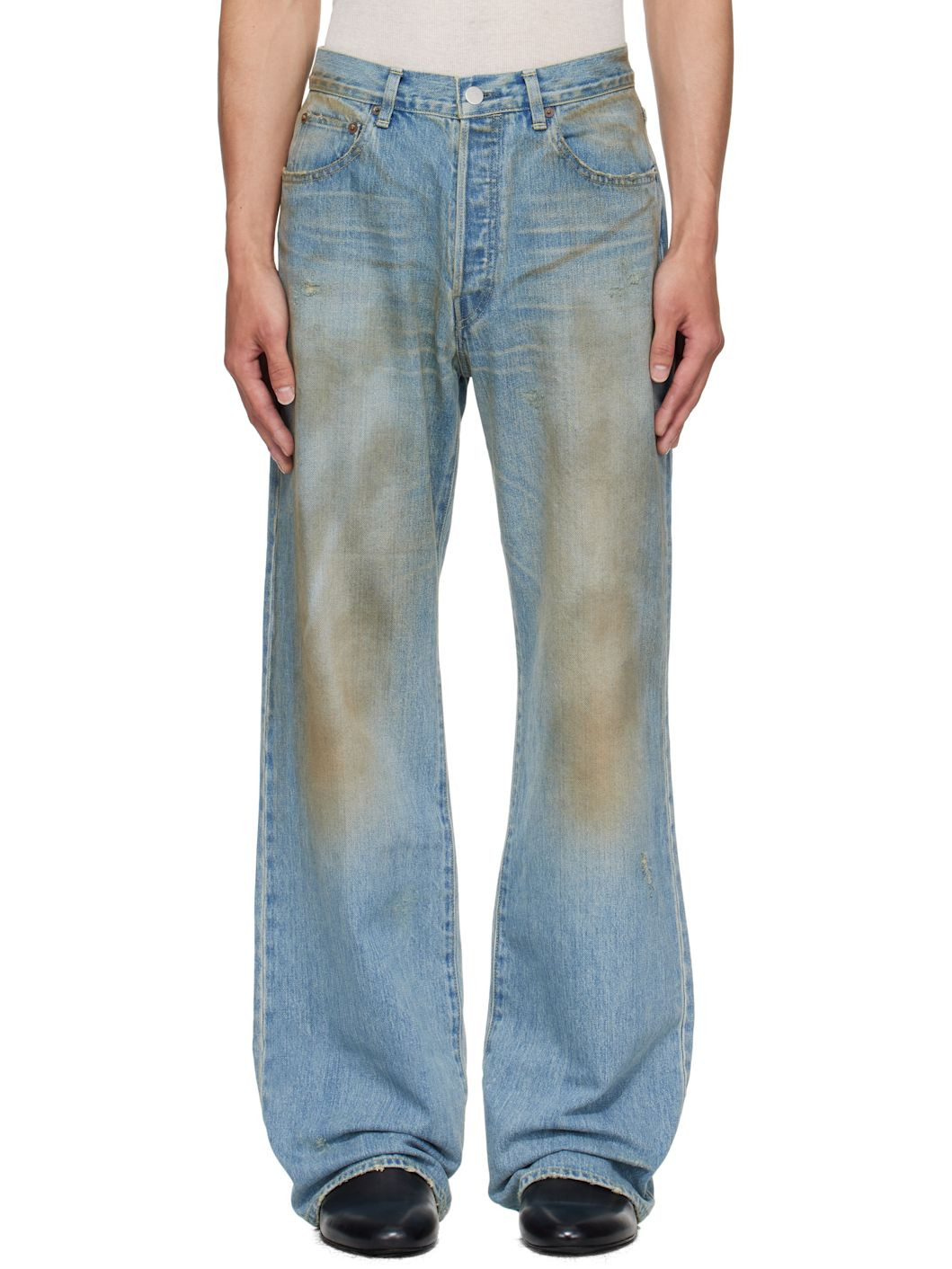 Non-stretch denim jeans. · Fading, whiskering, smudging, and distressing throughout · Flared · Belt loops · Five-pocket styling · Button fly · Suede patch at back waistband · Contrast stitching in yellow Supplier color: Indigo 100% cotton. Made in Japan 252996M186002