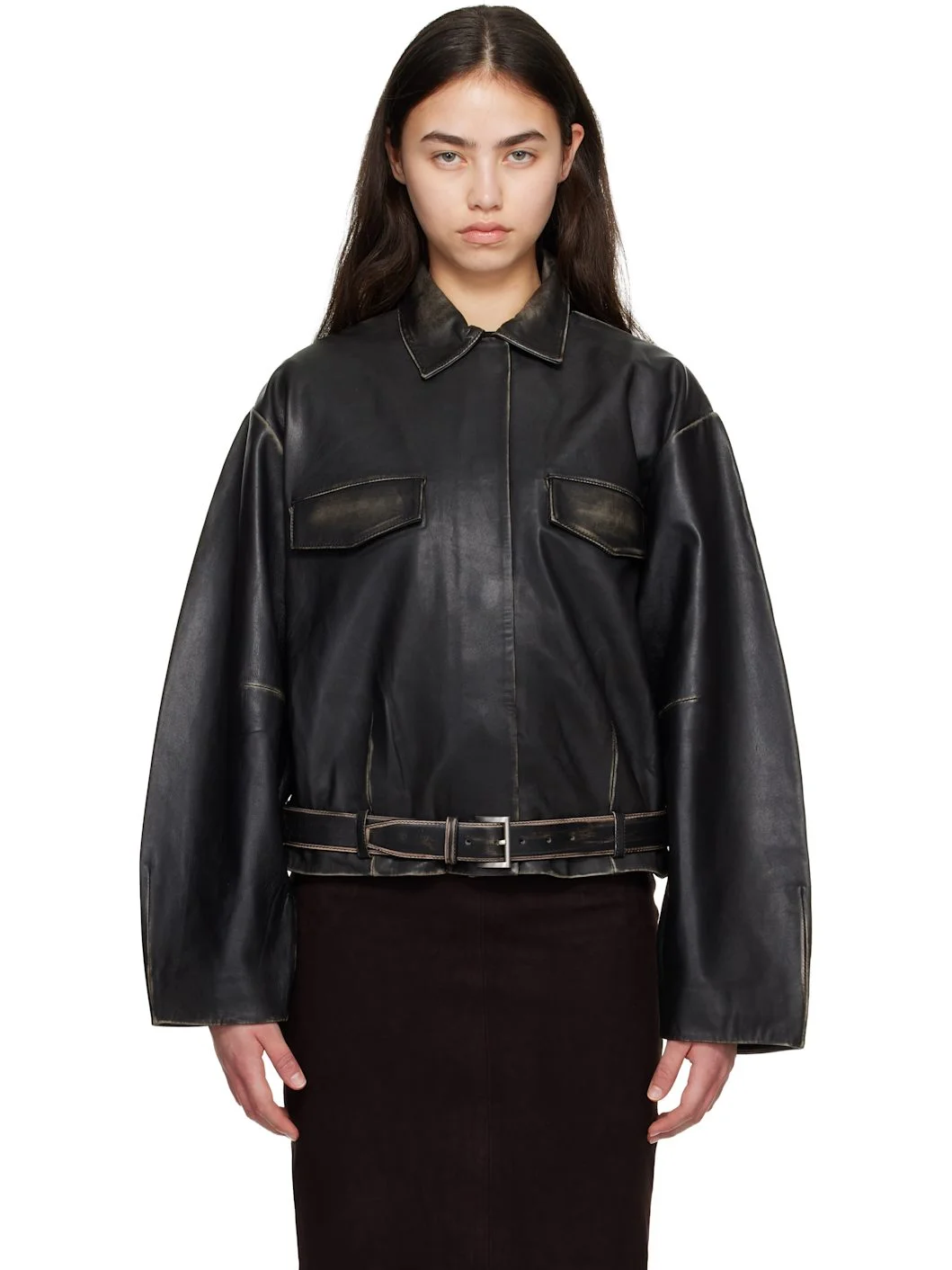 Black Brushed Belted Leather Jacket