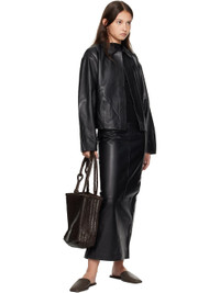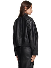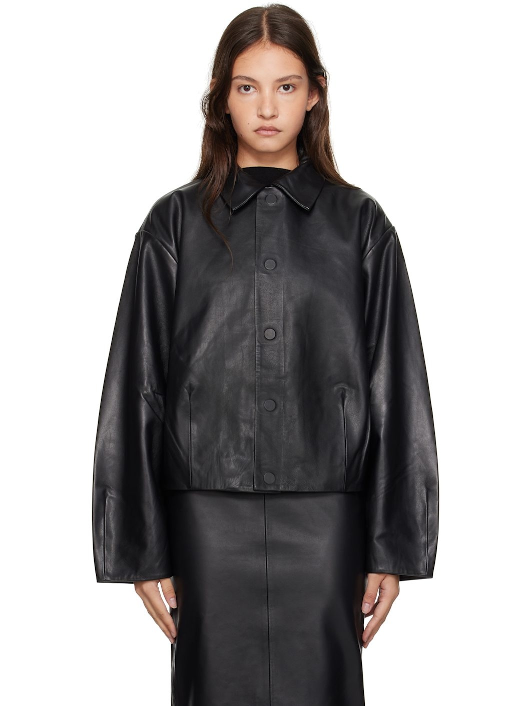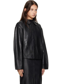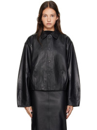 Vegetable-dyed buffed lambskin jacket. · LWG-certified leather · Spread collar · Concealed magnetic button closure · Darts at front, sleeves, and back · Seam pockets · Full TENCEL™ lyocell twill lining Supplier color: Black Body: 100% lambskin. Lining: 100% lyocell. Made in India 251193F064000