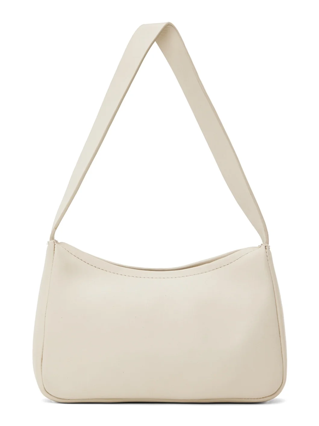 LWG-certified ChromeFree buffed leather shoulder bag in off-white. · Fixed shoulder strap · Zip closure · Patch pocket at interior · Suede lining · H5" x W8.25" x D2" Supplier color: Tofu