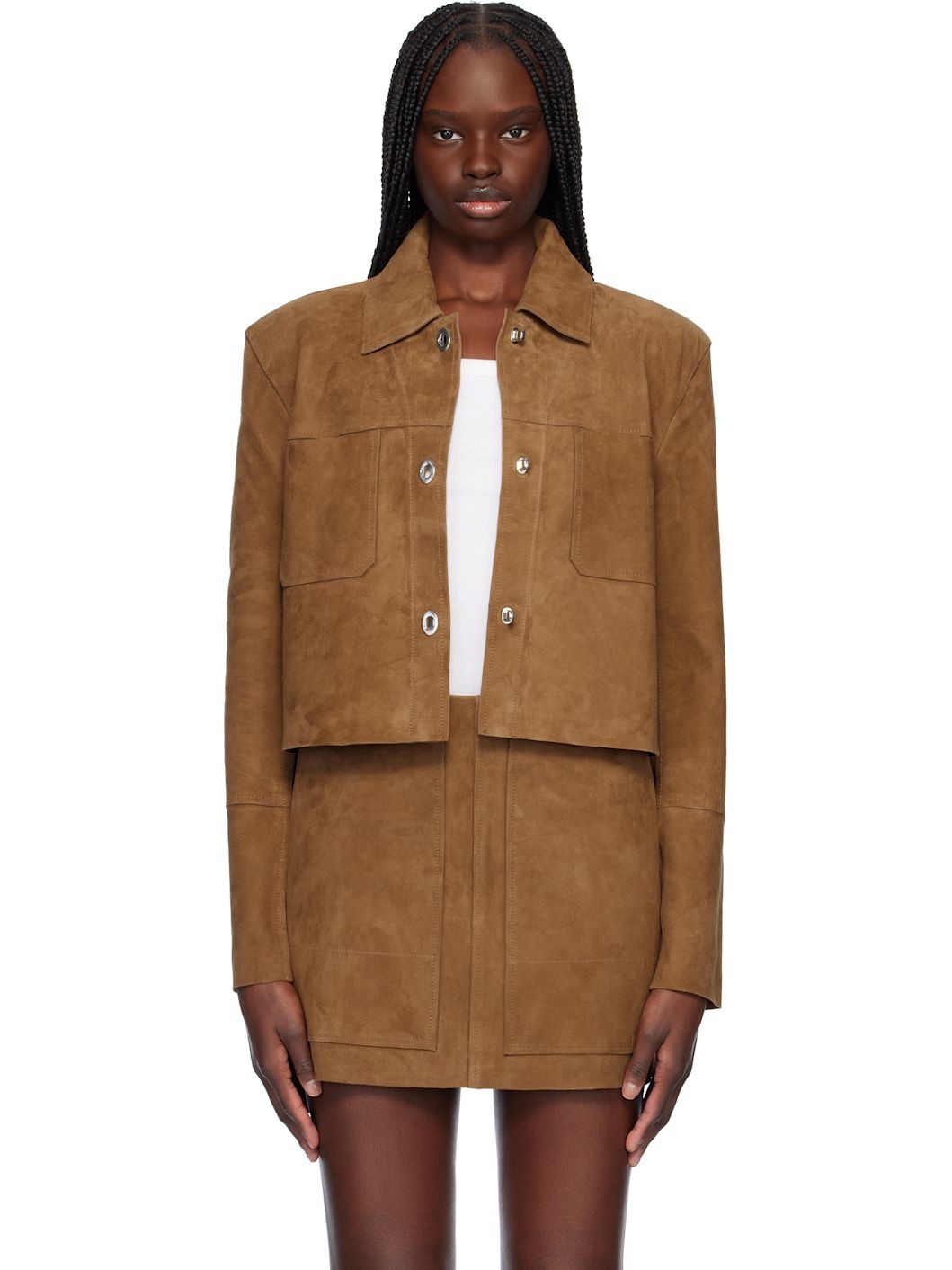 Goatskin suede jacket. · Spread collar · Turn-lock closure · Patch pockets · Raw edge at cropped hem and cuffs · Padded shoulders · Unlined Supplier color: Desert tan 100% goatskin. Made in India 251321F064012