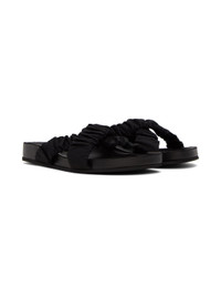 Grained nappa leather slip-on sandals in black. Ruching throughout. · Open round toe · Criss-crossing grosgrain straps at vamp · Logo embossed at molded footbed · Covered midsole · Textured rubber outsole Supplier color: Black Upper: leather. Sole: rubber. Made in Portugal 231386F124019