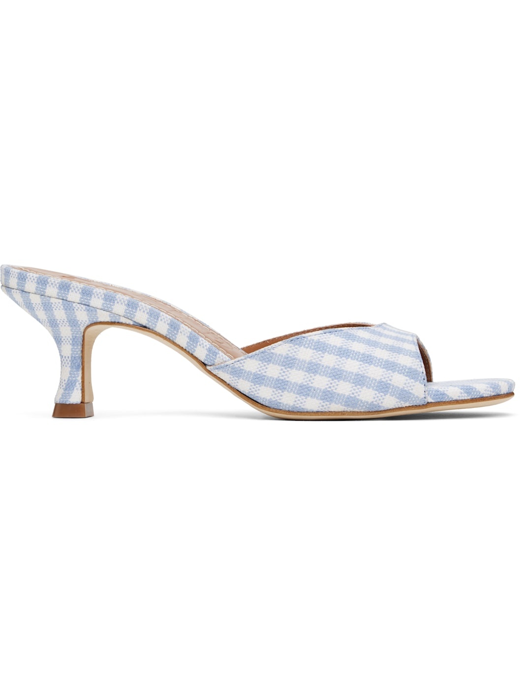 Cotton- and linen-blend canvas slip-on heeled sandals in blue and white. · Check pattern throughout · Open toe · Grained leather lining · Logo embossed at padded leather footbed · Covered kitten heel with rubber injection · Suede sole · Heel: H2.25" Supplier color: Sky micro check Upper: textile. Sole: leather, rubber. Made in Brazil 251386F125007
