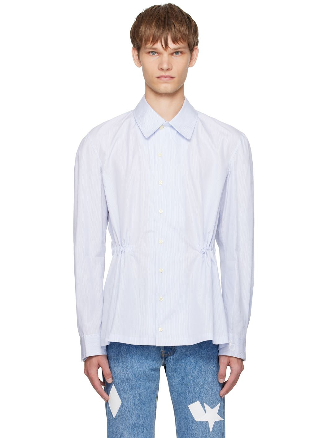 Cotton oxford cloth shirt. · Pinstripes throughout · Spread collar · Button closure · Buttoned barrel cuffs · Logo embroidered at cuff · Self-tie drawstring at interior waist Supplier color: Blue pinstripe 100% cotton. Made in United Kingdom 252300M192000
