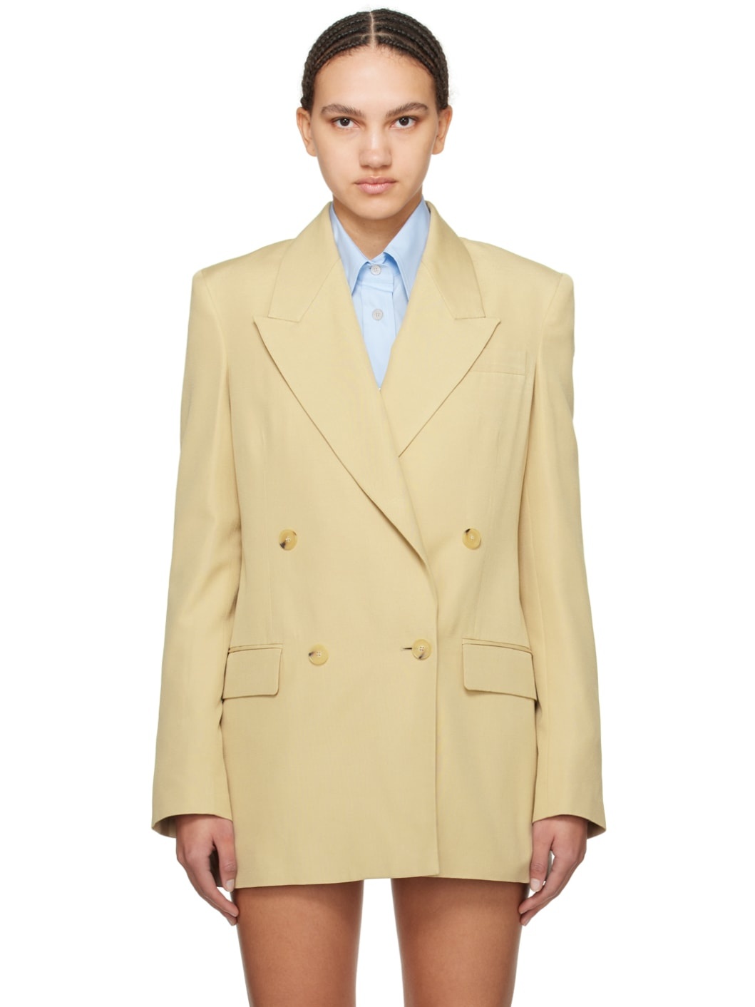 Plain-woven viscose blazer. · Peaked lapel · Double-breasted button closure · Welt pocket · Flap pockets · Padded shoulders · Four-button surgeon's cuffs · Central vent at back hem · Welt pocket at interior · Full logo-woven satin lining Made from cruelty-free, non-animal materials. Supplier color: Sand Body: 100% viscose. Lining: 60% viscose-rayon, 40% cupro. Made in Poland 241471F057000