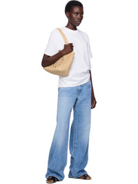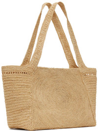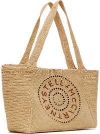 Handcrafted woven raffia tote in beige. · Fixed shoulder straps · Hand-embroidered logo at face · Magnetic press-stud closure · Patch pocket at interior · H9" x W15.5" x D5" Made from cruelty-free, non-animal materials. Supplier color: Natural Textile. Made in Madagascar 252471F049006