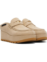 Faux-suede slip-on loafers. · Moc toe · Strap with logo disc at vamp · Logo flag at outer side · Faux-shearling lining · Foam rubber platform midsole · Treaded rubber sole · Platform: H1.5" · Heel: H2.25" Made from cruelty-free, non-animal materials. Supplier color: Desert Upper: synthetic. Sole: rubber. Made in Italy 252471F121001