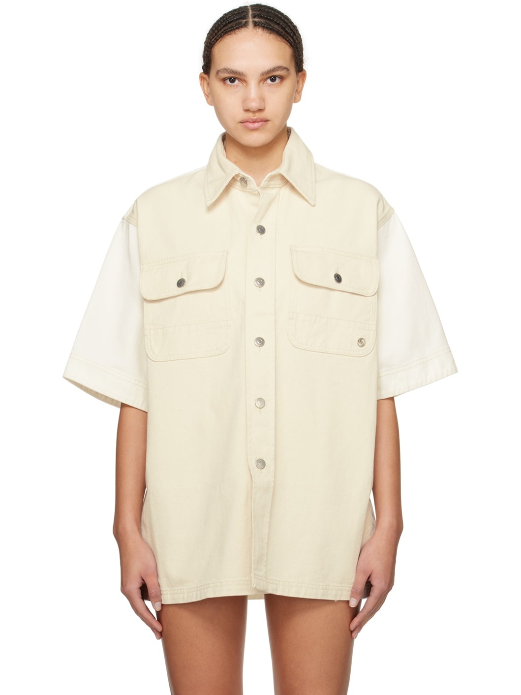 Non-stretch organic cotton denim shirt. · Spread collar · Button closure · Flap pockets · Logo hardware at front · Logo-engraved silver-tone hardware · Contrast stitching in beige Made from cruelty-free, non-animal materials. Supplier color: White/Ecru washed 100% organic cotton. Made in Italy 241471F109001