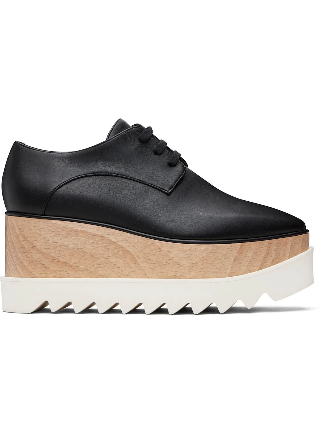 Grained faux-leather derbys. · Square toe · Lace-up closure · FSC®-certified wood platform midsole · Treaded foam rubber sole · Platform: H2.25" · Heel: H3" Made from cruelty-free, non-animal materials. Supplier color: Black Upper: synthetic. Sole: wood, rubber. Made in Italy 261471F120001