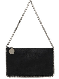 Handcrafted faux-suede shoulder bag in black. GOTS-certified organic cotton whipstitching and curb chain trim throughout. · Curb chain shoulder strap · Logo disc at zip closure · Logo-woven satin lining · Silver-tone hardware · H6" x W9.5" Made from cruelty-free, non-animal materials. Supplier color: Black Synthetic. Made in Italy 252471F048023