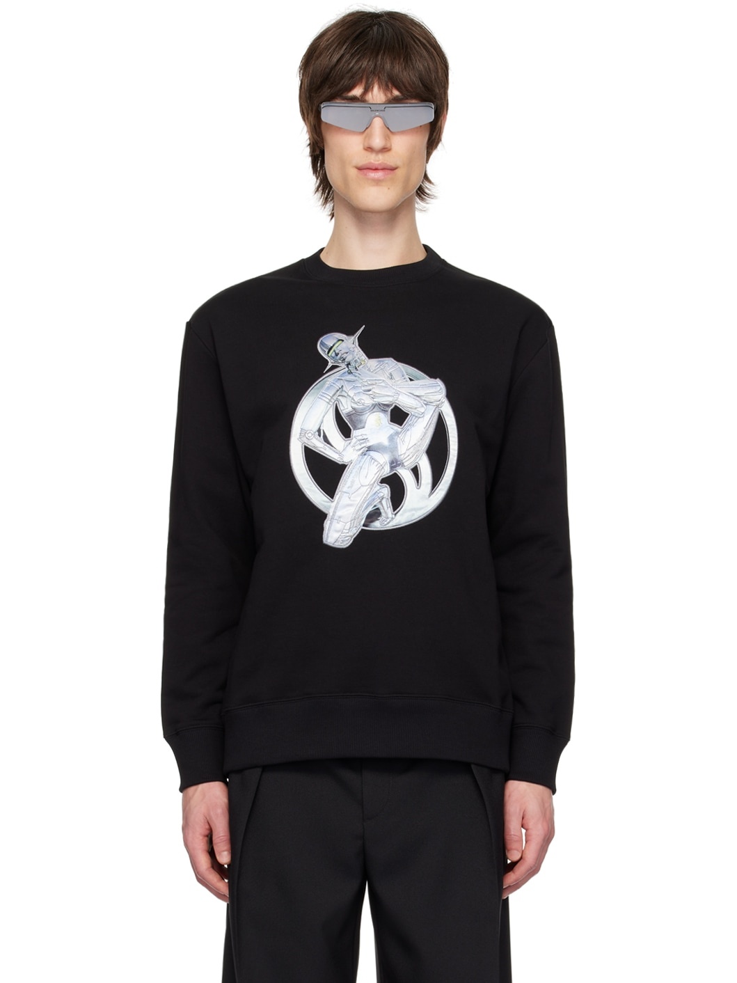 French terry sweatshirt. · Rib knit crewneck, hem, and cuffs · Graphic patch embroidered at front · Logo embroidered at back collar Part of the Stella McCartney Sorayama capsule collection. Made from cruelty-free, non-animal materials. Supplier color: Black Body: 100% cotton. Trim 1: 97% cotton, 3% elastane. Trim 2: 35% viscose, 25% polyamide, 25% metalled fibre, 15% polyester. Trim 3: 100% viscose. Made in Italy 241471M204000