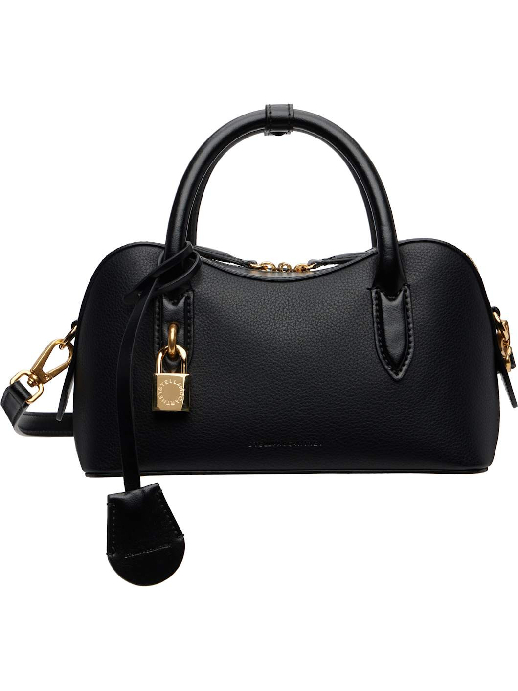 Grained faux-leather top handle bag. · Press-stud tab at rolled carry handles · Detachable logo-embossed sheathed key at handle · Adjustable and detachable crossbody strap · Padlock and embossed logo at face · Bumper studs at base · Two-way zip closure · Patch pocket at interior · GOTS-certified organic hemp-blend canvas lining · Logo-engraved antiqued gold-tone hardware · H5" x W9.25" x D3.5" Made from cruelty-free, non-animal materials. Supplier color: Black Synthetic. Made in Italy 252471F046003