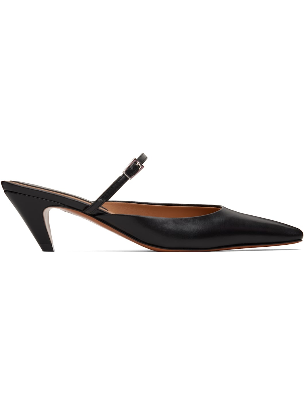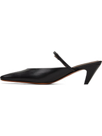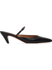 Handcrafted grained faux-leather slip-on heels in black. · Pointed square toe · Pin-buckle strap at vamp · Logo patch at padded footbed · Covered kitten heel with rubber injection · Faux-leather sole · Heel: H2" Made from cruelty-free, non-animal materials. Supplier color: Black Upper: synthetic. Sole: synthetic, rubber. Made in Italy 251471F122006