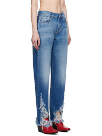 Non-stretch organic cotton denim jeans. Fading and distressing throughout. · Belt loops · Five-pocket styling · Zip-fly · Fraying at hems · Logo patch at back waistband · Logo-engraved silver-tone hardware · Contrast stitching in tan Made from cruelty-free, non-animal materials. Supplier color: Mid blue Body: 100% cotton. Trim: 57% polyester, 40% cotton, 3% viscose. Made in Italy 231471F069004