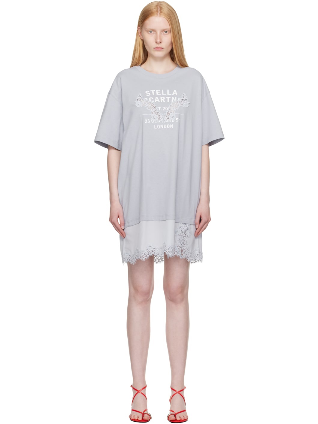 Boxy-fit GOTS-certified organic cotton jersey minidress. · Paneled construction · Rib-knit crewneck · Logo and text printed at chest · Floral lace trim with raw edges at chest and hem · Organic silk crepe panel at hem · Dropped shoulders Made from cruelty-free, non-animal materials. Supplier color: Angel blue Body: 100% organic cotton. Trim 1: 100% cotton. Trim 2: 100% organic silk. Trim 3: 47% polyamide, 39% cotton, 14% viscose. Made in Portugal 252471F052001