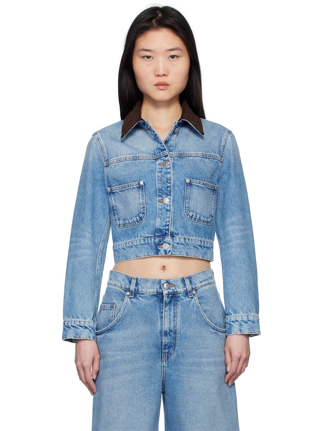 Non-stretch denim jacket. Fading throughout. · Corduroy spread collar · Button closure · Patch pockets · Cropped hem · Single-button barrel cuffs · Leather logo patch at back hem · Logo-engraved silver-tone hardware · Contrast stitching in tan Made from cruelty-free, non-animal materials. Supplier color: Medium vintage 100% cotton. Made in Italy 251471F060000