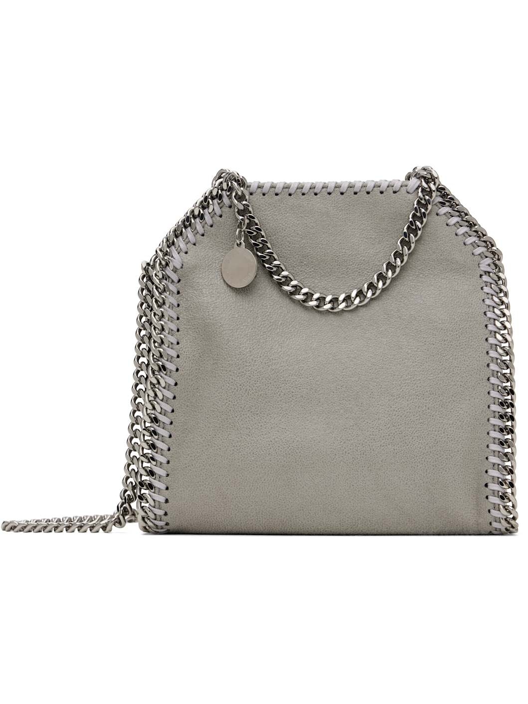 Faux-suede shoulder bag in gray. GOTS-certified organic cotton whipstitching and curb chain trim throughout. · Curb chain carry handles · Logo disc at carry handle · Curb chain crossbody strap · Magnetic press-stud closure · Patch pocket at interior · Logo-woven satin lining · Silver-tone hardware · H7.5" x W7" x D2.5" Made from cruelty-free, non-animal materials. Supplier color: Light grey Synthetic. Made in Italy 252471F048008