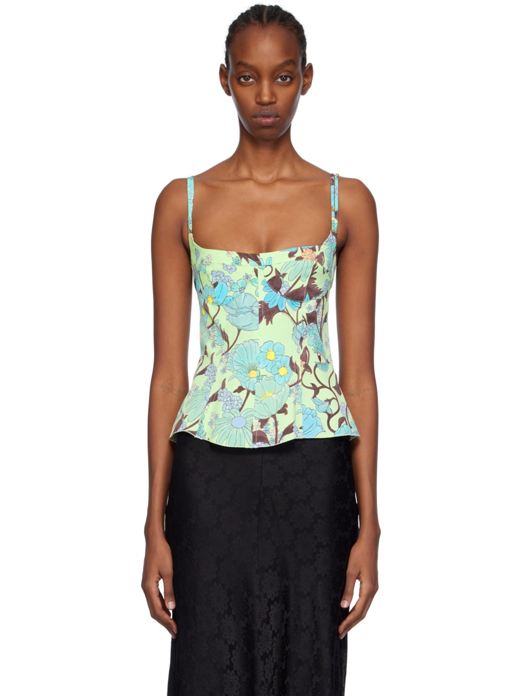 Stretch viscose satin camisole. Graphic pattern printed throughout. · Paneled construction · Square neck · Peplum hem · Fixed spaghetti straps · Concealed zip closure at back · Partial crepe lining Made from cruelty-free, non-animal materials. Supplier color: Multicolor mint 94% viscose, 6% spandex. Made in Italy 241471F111002