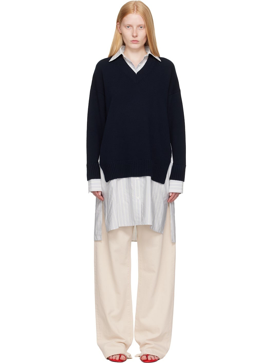 Knit RWS-certified virgin wool midi dress. Striped silk- and organic cotton-blend oxford cloth panels throughout. · Layered construction · Spread collar · Rib-knit trim at V-neck, hem, and cuffs · Three-button placket · Vented side seams · Dropped shoulders · Buttoned barrel cuffs · Logo-engraved hardware Made from cruelty-free, non-animal materials. Supplier color: Navy Body 1: 100% virgin wool. Body 2: 54% silk, 46% organic cotton. Trim: 100% virgin wool. Made in Romania 252471F054000