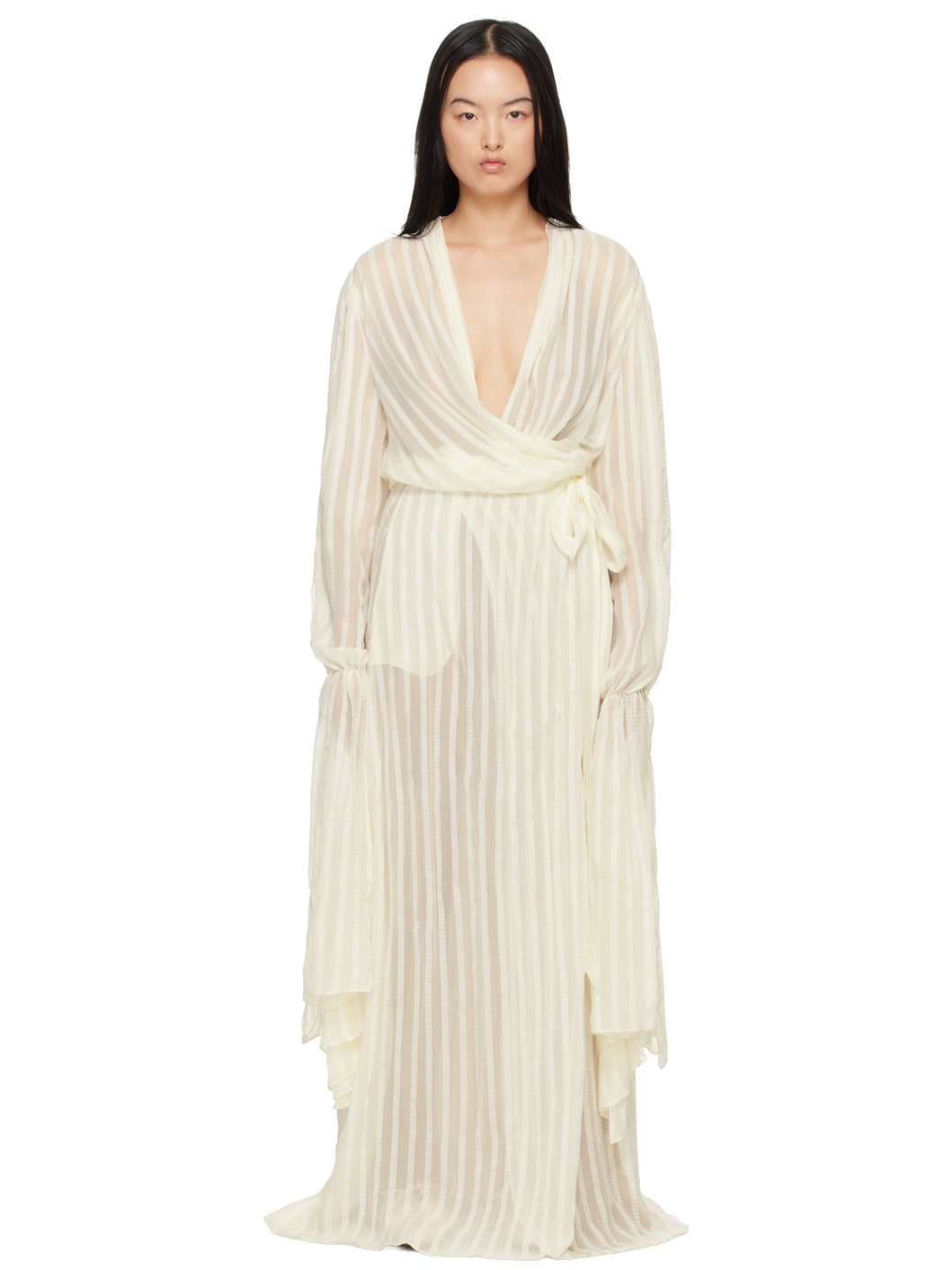 Semi-sheer GOTS-certified organic silk- and viscose-blend chiffon dress. Jacquard stripes throughout. · Wrap construction · Gathering at plunging V-neck · Self-tie closure · Seam pockets · Button fastening and extended trim at cuffs · Slip-style viscose organza underlay Made from cruelty-free, non-animal materials. Supplier color: White Body: 67% organic silk, 33% viscose. Lining: 100% viscose. Made in Italy 241471F055007