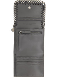 Faux-suede trifold wallet in metallic-silver tone. GOTS-certified organic cotton whipstitching and curb chain trim at foldover flap. · Logo disc at side · Press-stud closure · Zip coin compartment · Six card slots · One patch pocket · Central note slot · Logo-woven satin lining · Faux-leather interior · Silver-tone hardware · H3.75" x W4.5" x D1" Made from cruelty-free, non-animal materials. Supplier color: Steel grey Synthetic. Made in Italy 252471F040002