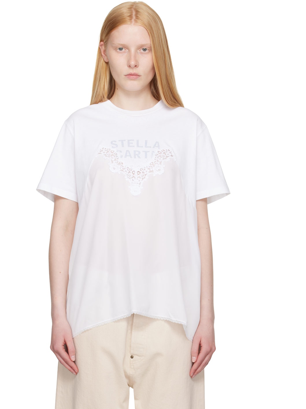 GOTS-certified organic cotton jersey T-shirt. · Paneled construction · Rib-knit crewneck · Logo printed at chest · Floral lace trim with raw edges at chest · Organic silk crepe panel at front · Picot trim at hem Made from cruelty-free, non-animal materials. Supplier color: Pure white Body 1: 100% organic cotton. Body 2: 100% organic silk. Trim 1: 100% cotton. Trim 2: 100% polyester. Trim 3: 47% polyamide, 39% cotton, 14% viscose. Made in Portugal 252471F110003