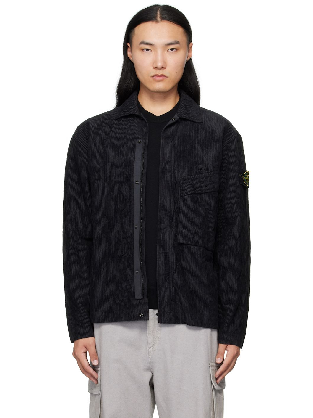 Garment-dyed cotton-blend corduroy jacket. · Spread collar · Concealed zip closure with press-stud placket · Press-stud flap pocket at chest · Detachable logo patch at sleeve · Press-stud fastening at cuffs · Press-stud pocket at interior · Unlined Supplier color: Black 76% cotton, 24% nylon. Made in Romania 252828M192007